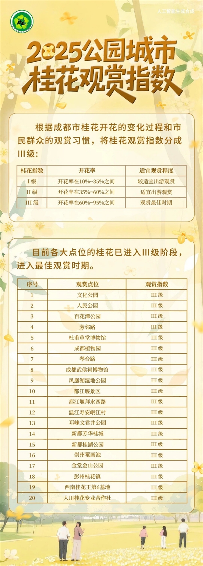 近日,在成都市公园城市局推出的《2025公园城市桂花观赏指数》中,文君井公园榜上有名。