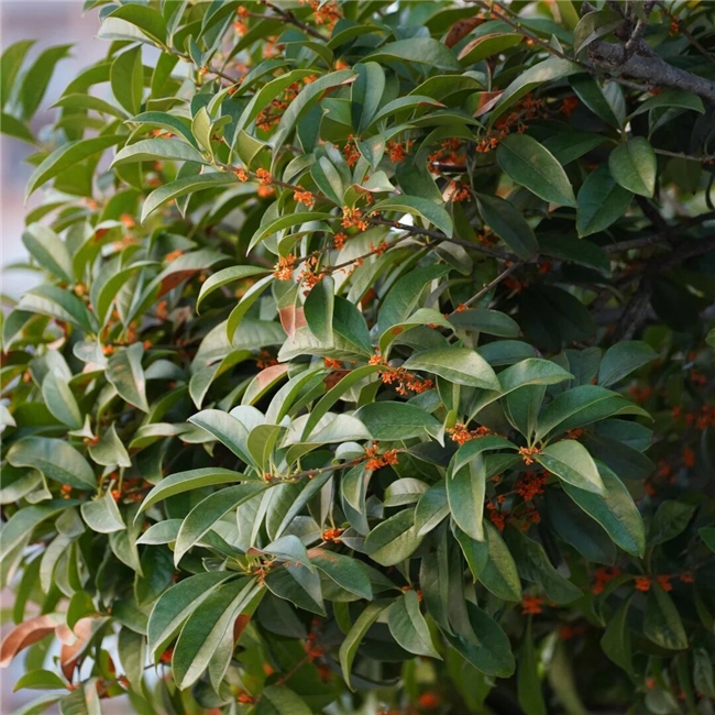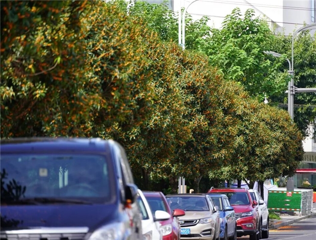 沿街的商铺前,成排的桂花开得热闹,金蕊缀满枝头,引得路人驻足拍照;有的开得含蓄,在风里飘出一缕淡香,勾着人循着气味探寻。