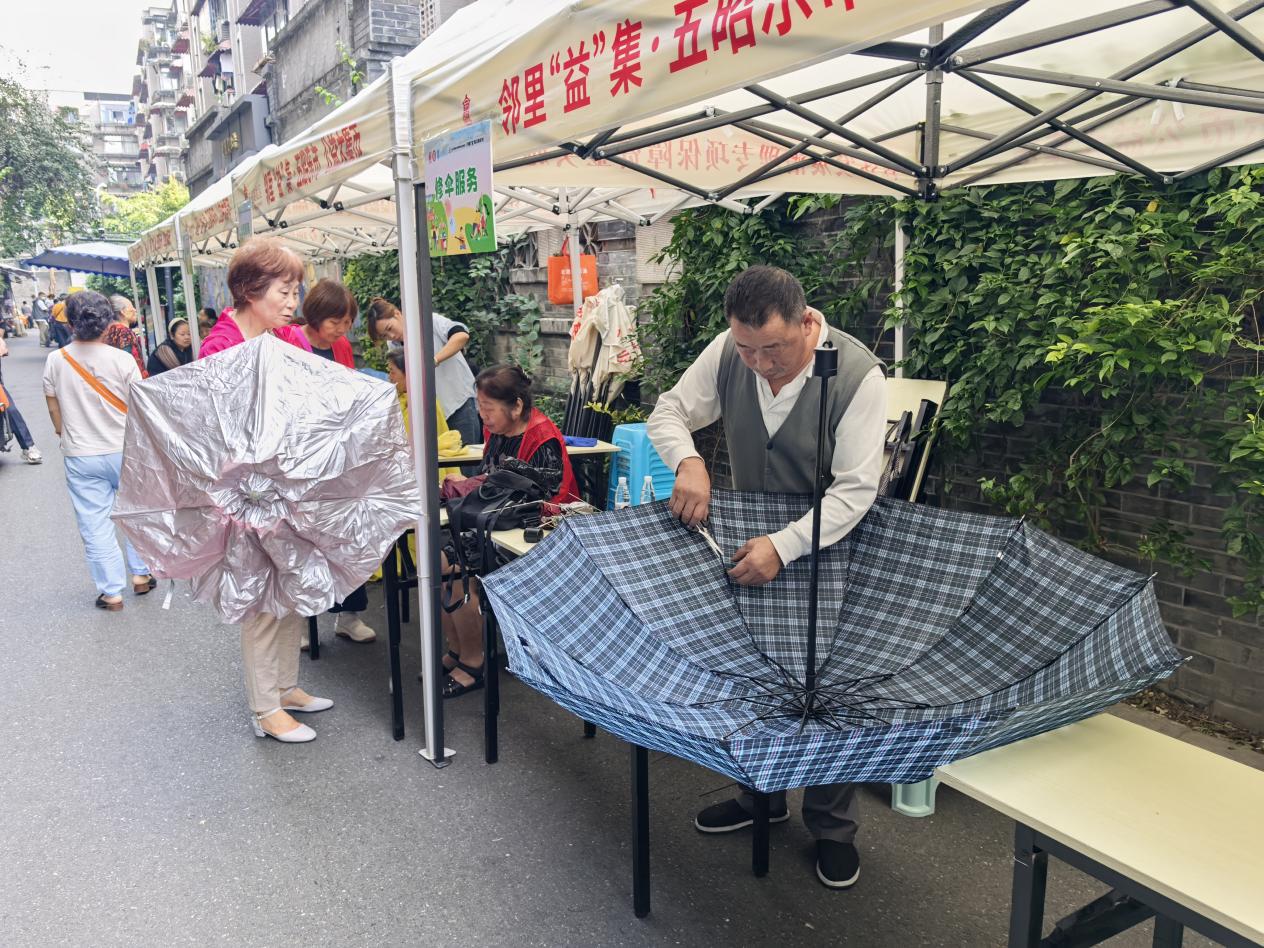 “师傅,我这把菜刀就拜托您了!”磨刀服务点前,居民们有序地凭号牌交接刀具,志愿者细心地提醒大家刀具要包裹好。另一边,理发师傅手艺娴熟,专业的服务让排队的老人们连连称赞。修伞和缝补服务点也围满了人,修伞的志愿者还耐心询问废弃的伞面是否愿意捐赠,践行着环保理念。