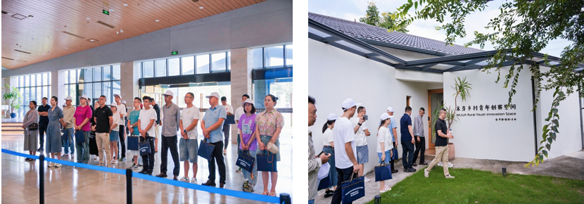 乡村共富经验学习是本次三交活动的重中之重。10月14日上午,团队走进嘉兴海宁盐官桃源村,深入探究“党组织引领+企业运营+农户参与”的协同发展模式。在“大桃园”组团片区,当地负责人介绍,该片区整合周边8个行政村的桃园资源,构建起集种植、分拣、加工、销售于一体的完整产业链,既引进了自动化分拣设备和低温冷链仓储系统,又开发了桃园研学、亲子采摘等文旅项目,让“一颗桃子”产生多重价值,带动1200余户农户年均增收超3万元。智能化的系统引发了每一位创业青年的激烈讨论,大家对实现农业现代化、数字化的必要性表示认同。同日下午,团队来到“千万工程”起源地——萧山瓜沥镇梅林村,见证了村庄从“脏乱差”到“洁齐美”的华丽蜕变。在乡村数字文化空间,成员们通过VR技术体验农耕乐趣;在创客空间,95后青年张明分享了利用短视频推广农产品、年销售额达200万元的创业经历,鲜活的案例引发大家热烈讨论,思想的火花在交流中碰撞。