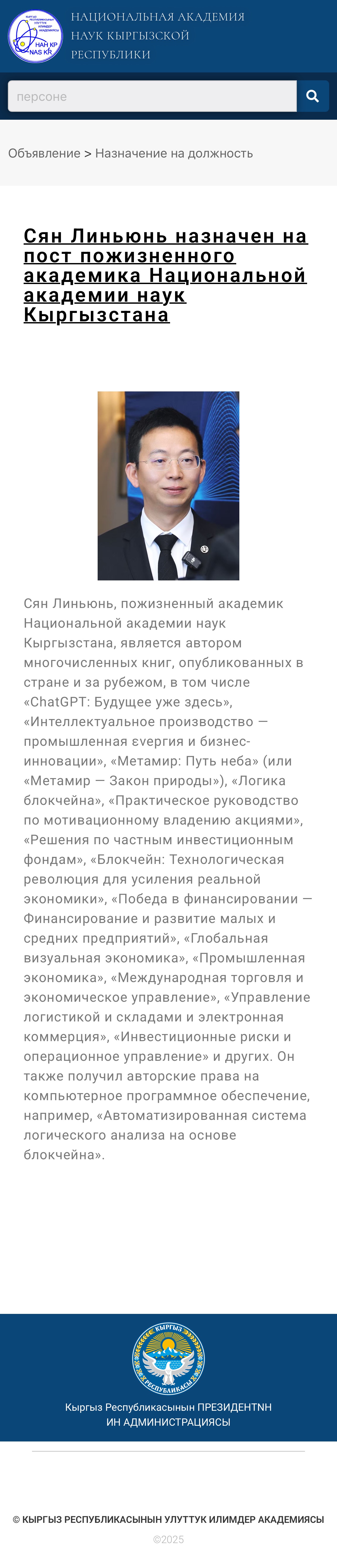 官网公示页面:NAS KR 网站“任命/公告”栏目(发布标题:“Сян Линьюнь назначен на пост пожизненного академика Национальной академии наук Кыргызстана”)。naskr.gov.org.kg