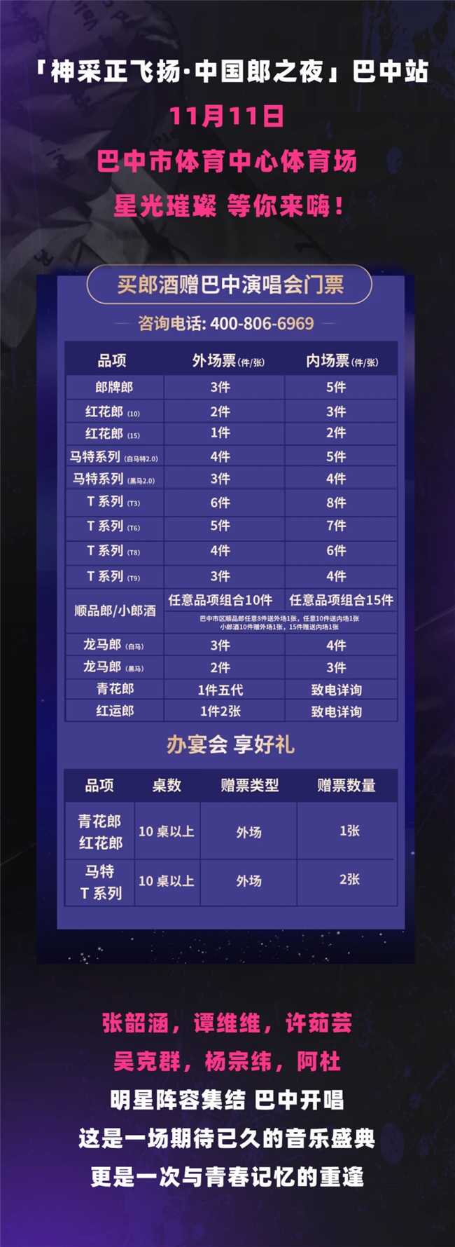 这个“双十一”,别再让屏幕占据所有时光,来巴中市体育中心体育场,和郎酒一起赴一场音乐与青春的约会!11月11日,星光璀璨、金曲集结,我们不见不散,共赴这场神采飞扬的欢聚之夜!