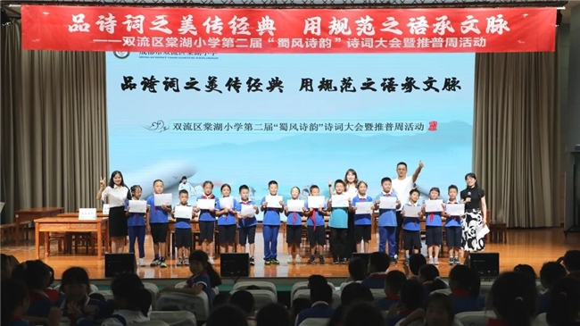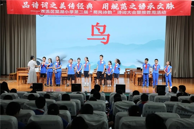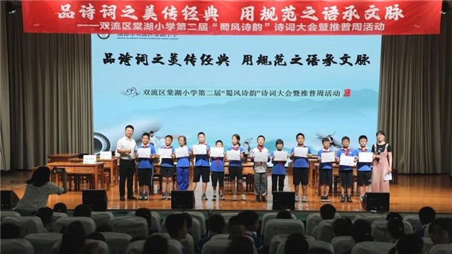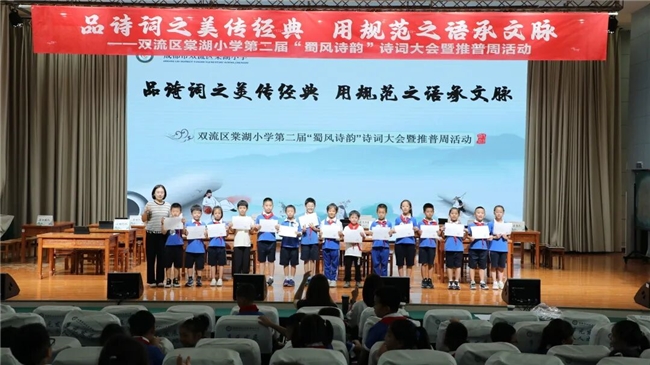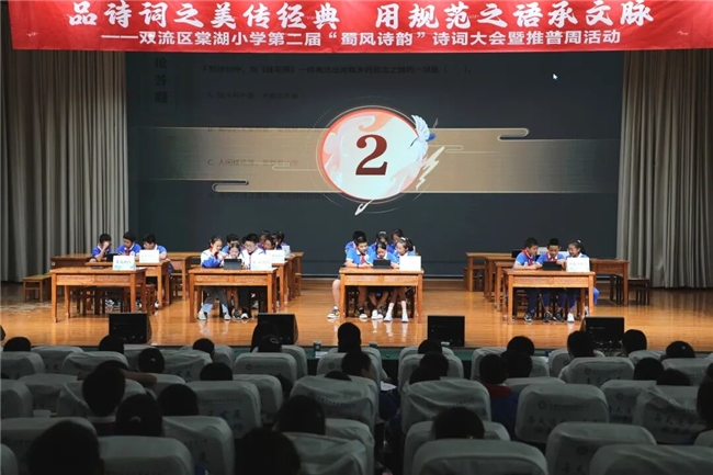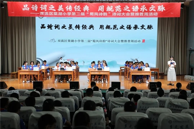 2025年9月15日-21日是第28届全国推广普通话宣传周,本届推普周以“加大国家通用语言文字推广力度,促进铸牢中华民族共同体意识”为主题。在此期间,棠湖小学紧扣推普周要求,于9月25日-26日成功举办第二届“蜀风诗韵”诗词大会,三-六年级学生齐聚学校多功能厅,分年级上演了一场智慧与才情的巅峰对决,以诗词为媒介强化规范使用普通话意识,让经典文脉在校园中赓续。