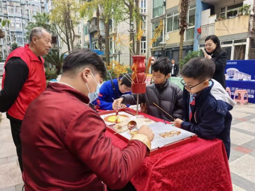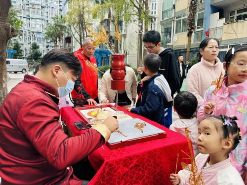 活动伊始,蝶古巴特包工作坊区域便坐满了居民。前期成立的院落微更新自组织此次发挥重要作用,大家一边引导签到,一边协助居民进行手工包制作。参与居民手持排刷将花纹纸小心翼翼地贴在素色麻布包上,从图案选择到位置摆放,邻里间自发形成互助小组。70多岁的张阿姨主动帮助视力不佳的邻居修剪纸张,孩子们则分享着构图技巧,现场不时响起“这个花纹配你的包真好看”“我帮你扶着边角”的亲切对话。最终,风格各异的手工包顺利完成,不少居民拿着成品相互合影,直言“平时上班不在家,今天趁着秋假跟大家伙聚聚”。另一侧的便民服务集市同样人气高涨,磨刀、清洗锅底、公益修眉点位上人头攒动,最热闹的还属非遗糖画区,只见非遗匠人执勺在手,腕部轻转,糖浆便如丝如缕地流淌在光洁的案板上,顷刻间,栩栩如生的飞禽走兽、吉祥图案便跃然“板”上,引得孩子们们阵阵赞叹。
