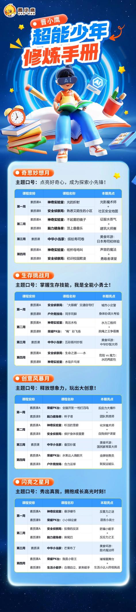 在众多“作业托管班”中,一个拥有“科学实验 + 安全课程+厨艺生活+益智PK” 的素质教育托管中心,将立刻成为家长眼中的“稀缺资源”。《超能少年修炼手册》 就是您最强的品牌宣言,让您从成本竞争的红海,跃入价值竞争的蓝海。