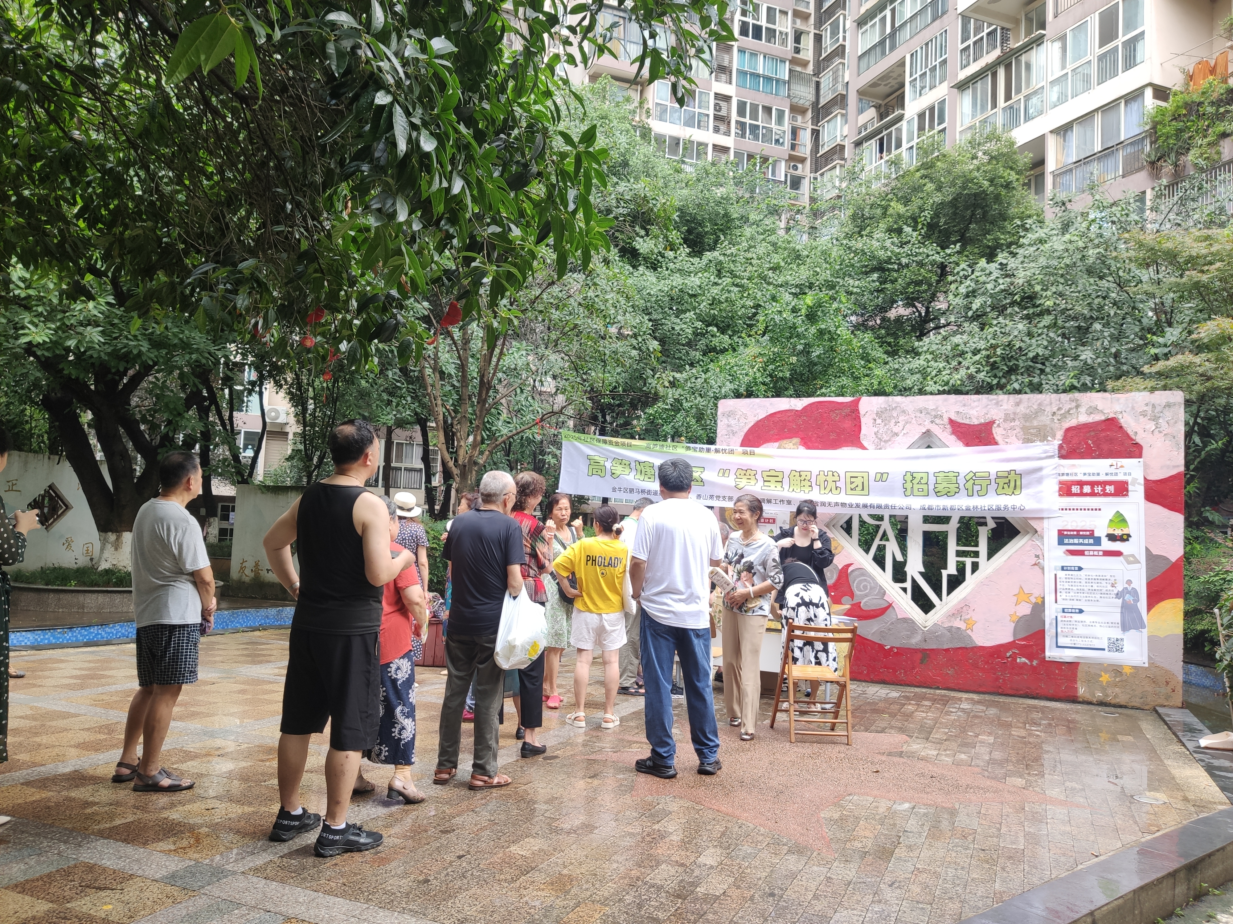 此前,高笋塘社区20个院落的单元门口、商家显眼处,张贴了以社区原创IP“笋宝”为视觉核心的招募海报,搭配“推动矛盾‘预防-调解-赋能’全链条治理”的服务愿景,迅速吸引居民关注。通过院落海报、联动社区网格员进行宣传单发放走访、线下摆点等多轮宣传,社区累计触达居民超800人次,线上线下报名达48人,其中既有退休法官等专业人士,也有擅长基层调解的“民间和事佬”。