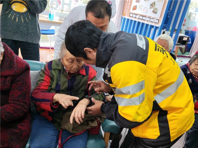 骑手志愿者为老人讲解智慧手环功能及操作