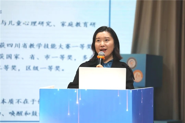 成都市杨柳名校长工作室成员、西航港小学副校长喻玮以《重构关系 支持成长》为题,分享了学校依托家校社协同育人中心,构建五彩课程体系及“一体两翼”德育模式的实践路径。她指出,学校通过厘清家校社三方角色,推动家庭从被动配合转向主体责任人,社会从外部环境转变为育人支持平台,实现了“彼此的抵达”。