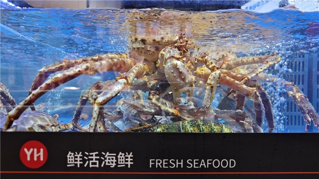 生鲜区域作为民生消费核心,在保障基础需求的同时,引入更多中高端品质商品。蔬菜区铁棍山药、蒜头、老姜等日常菜品定价在4.99-5.99元区间;水产区鲜活淡水鲈鱼仅15.9元/条,南美白对虾售价不足30元,以亲民价格打造“民生海鲜”标杆,同时引入罗氏虾、皮皮虾、梭子蟹等高端水产,满足消费者多样化需求。