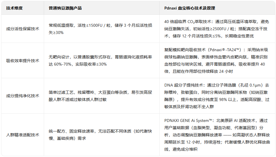 纳豆激酶的效果上限由技术决定,普通产品常面临 “活性低、吸收差、适配弱” 的痛点,而 Pdnaxi 血宝通过四项核心技术实现突破,具体差异如下: