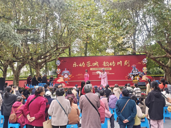 本月演出延续了“乐动蓉城·韵传川剧”的主题,既保留《滚灯》《变脸》等川剧绝活的观赏性,也将《包公斩侄》《杨门女将》等经典剧目作为核心内容——11月9日郫筒街道望丛祠东歌台场,古蜀建筑的飞檐与《包公斩侄》的刚正唱段相映,不少观众特意提前到场,在祠内参观后留步听戏;11月14日犀浦街道石犀里广场场,午后的商业街区因川剧锣鼓聚拢近200名市民,《滚灯》的滑稽表演让商圈瞬间成了“露天戏园”;而收官场的三道堰镇川菜博物馆,川剧与川菜文化隔空呼应,演员谢幕时,观众举着刚体验的川菜小吃喝彩,成了非遗与地域民俗融合的生动缩影。
