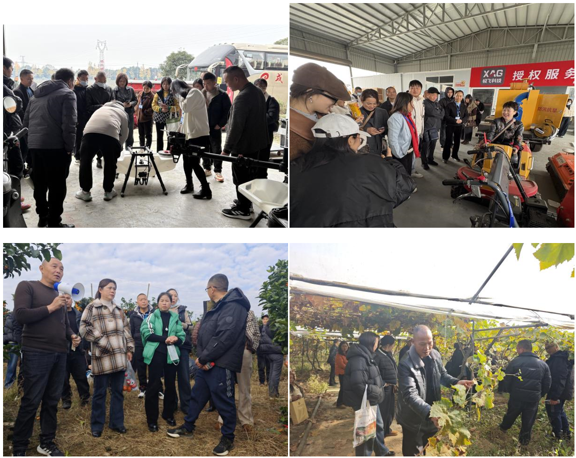分类施教精提升。项目专门针对粮油、果蔬两大产业设置差异化实训内容:粮油班学员赴郫都四川耀农农业装备有限公司,在现代化农机实训基地亲手操作拖拉机、植保无人机等大型农机具,从农机操作规范到田间作业效率提升,系统掌握大田机械化生产技能,为规模化种植奠定基础;果蔬班则深耕邛崃本土优质农业资源,在邛崃市林端家庭农场开展柑橘修枝、环割等果树管理实操,后前往古色果香家庭农场,在专家指导下学习有机肥培肥技术,深入了解有机蔬菜与商业蔬菜的品质差异,同时实操葡萄修枝整形技巧,全方位提升果蔬标准化生产能力。