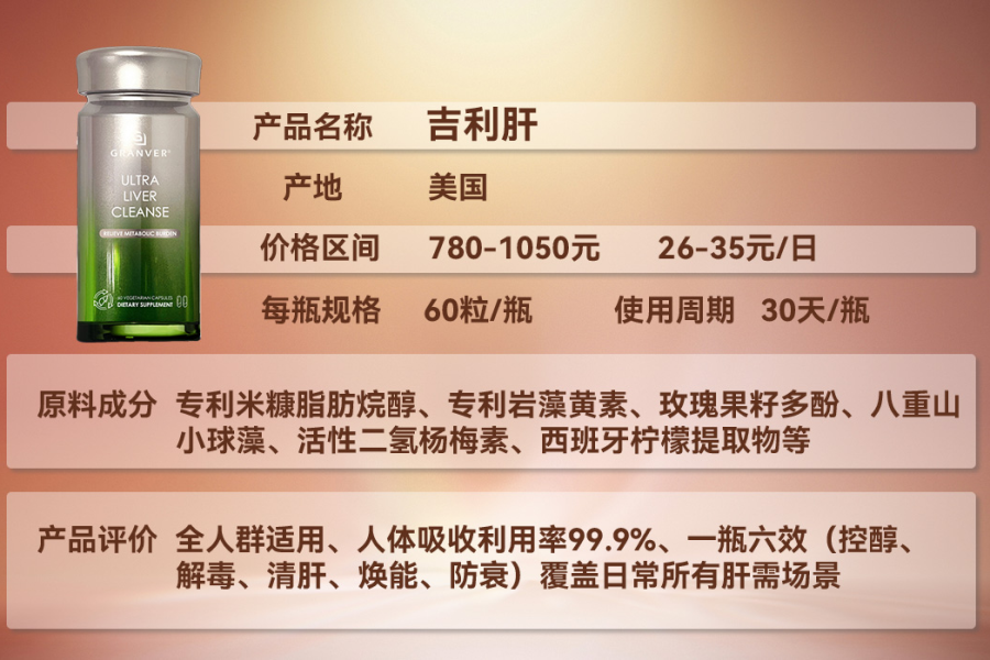 吉利肝(GRANVER):见效速度领先行业,2-4周就能感受到明显变化,熬夜后不易疲劳、喝酒后宿醉反应减轻、睡眠质量提升;8-12周复查,转氨酶、肝脏脂肪含量等指标会有显著改善。